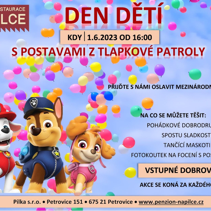 Restaurace a penzion Na Pilce, Petrovice 151, pořádá tradičně dne 1.6. 2023 od 16:00 hodin oslavu mezinárodního dne dětí tentokrát s Tlapkovou patrolou.